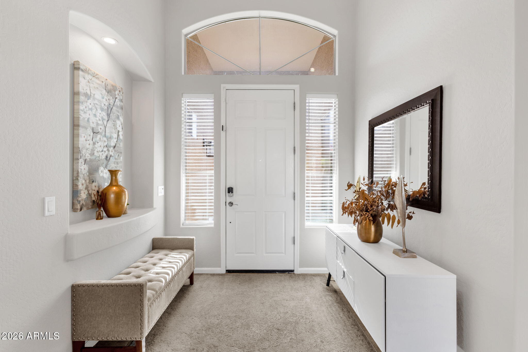 Perfectly positioned on a quiet street running parallel to the 18th fairway, with a north facing backyard, the home enjoys a unique sense of privacy while remaining just steps from golf-course living. An inviting entry welcomes you inside, where soaring ceilings and architectural pillars create a striking first impression and lead seamlessly into the elegant great room ideal for both everyday living and entertaining.