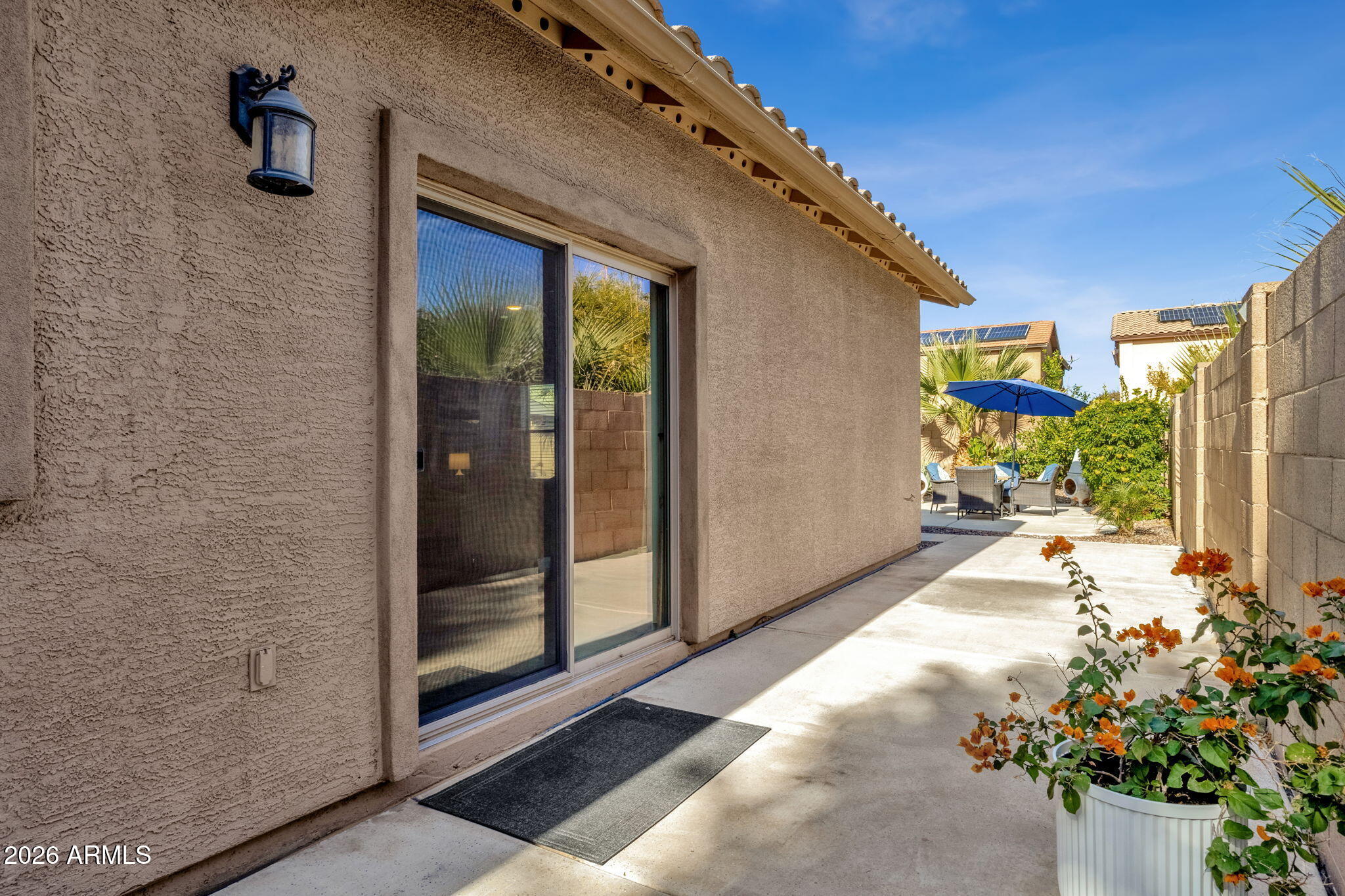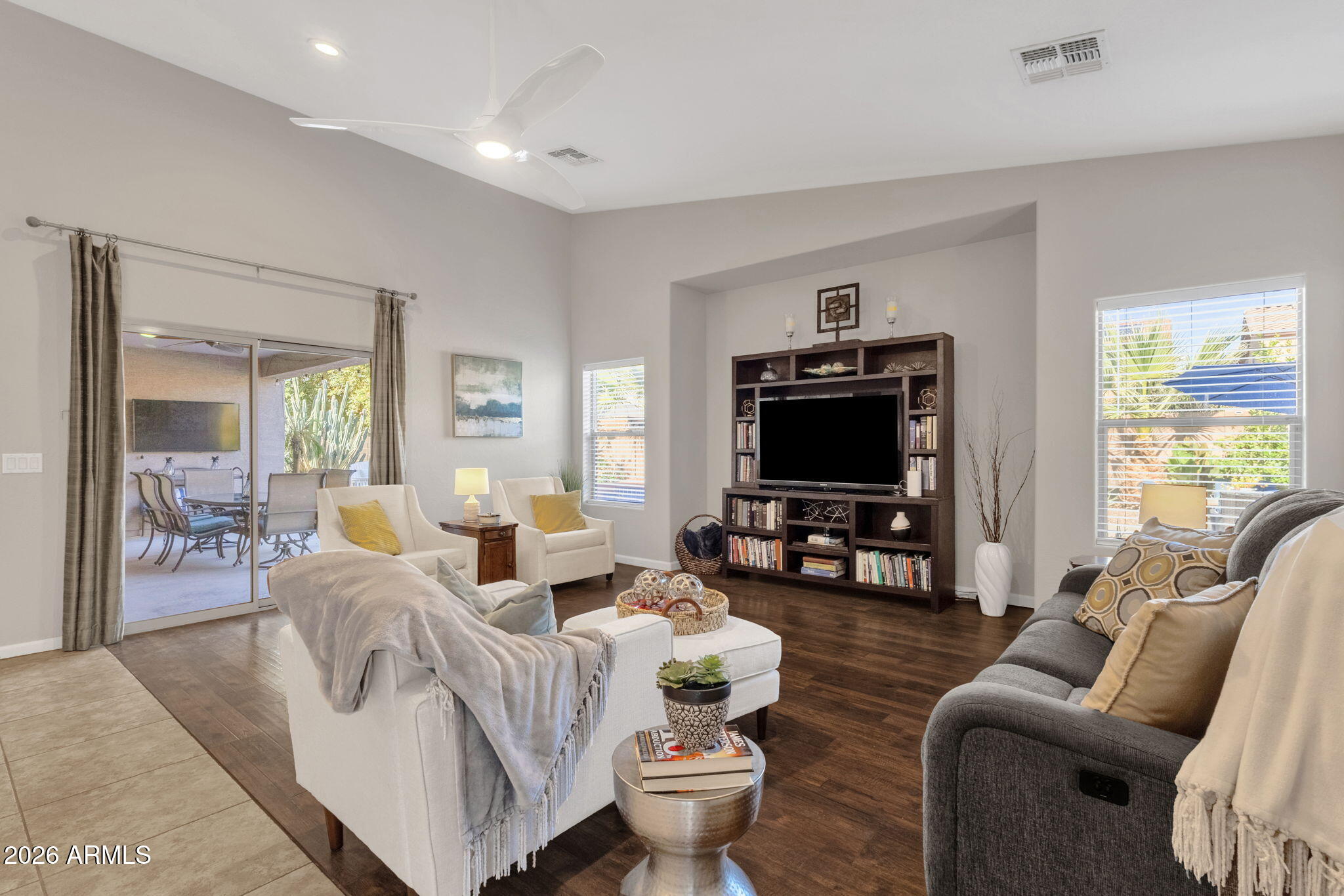 Step outside to a resort-style backyard designed for year-round enjoyment. A large covered patio overlooks lush yet low-maintenance landscaping with a blend of desert and tropical landscaping, including palms and citrus trees, all supported by a full irrigation system. The centerpiece is the heated saltwater pool with upgraded gas heating, allowing for comfortable use in every season. The seller will even include a brand new removable pool fence for added piece of mind.